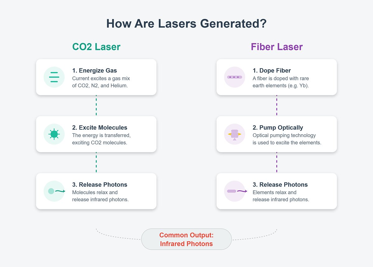 उत्पादन विधि: यह मुख्य रूप से उस सामग्री द्वारा उत्पन्न होता है जिसे लेज़र बीम द्वारा गर्म किया जाता है। CO2 लेज़र में, विद्युत धारा गैस मिश्रण (मुख्य रूप से कार्बन डाइऑक्साइड, नाइट्रोजन और हीलियम) को प्रवाहित करती है, फिर कार्बन डाइऑक्साइड अणुओं को उत्तेजित करती है। जब ये अणु अपनी मूल अवस्था में लौटते हैं, तो इन्फ्रारेड फोटॉनों का उत्सर्जन होता है। साथ ही, फाइबर लेज़र दुर्लभ पृथ्वी तत्वों (जैसे यिट्रियम और एर्बियम) से डोप्ड फाइबर का उपयोग करता है, ये तत्व ऑप्टिकल पंपिंग तकनीक द्वारा भी इन्फ्रारेड फोटॉनों का उत्सर्जन कर सकते हैं।.