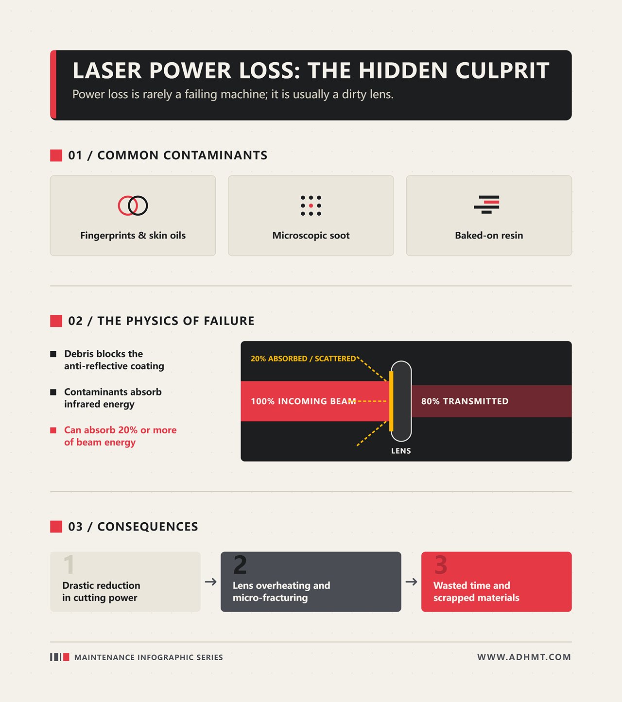 亜セレン化亜鉛のフォーカスレンズにたったひとつの指紋が付くだけで、機械の物理特性が変わります。ガラスに触れると、皮脂の油分が反射防止コーティングに移ります。レーザービームはこのレンズを通って一点に収束しますが、油や前回の加工で発生した微細な煤が残っていると、その汚れが赤外線エネルギーを吸収し、通過を妨げます。.